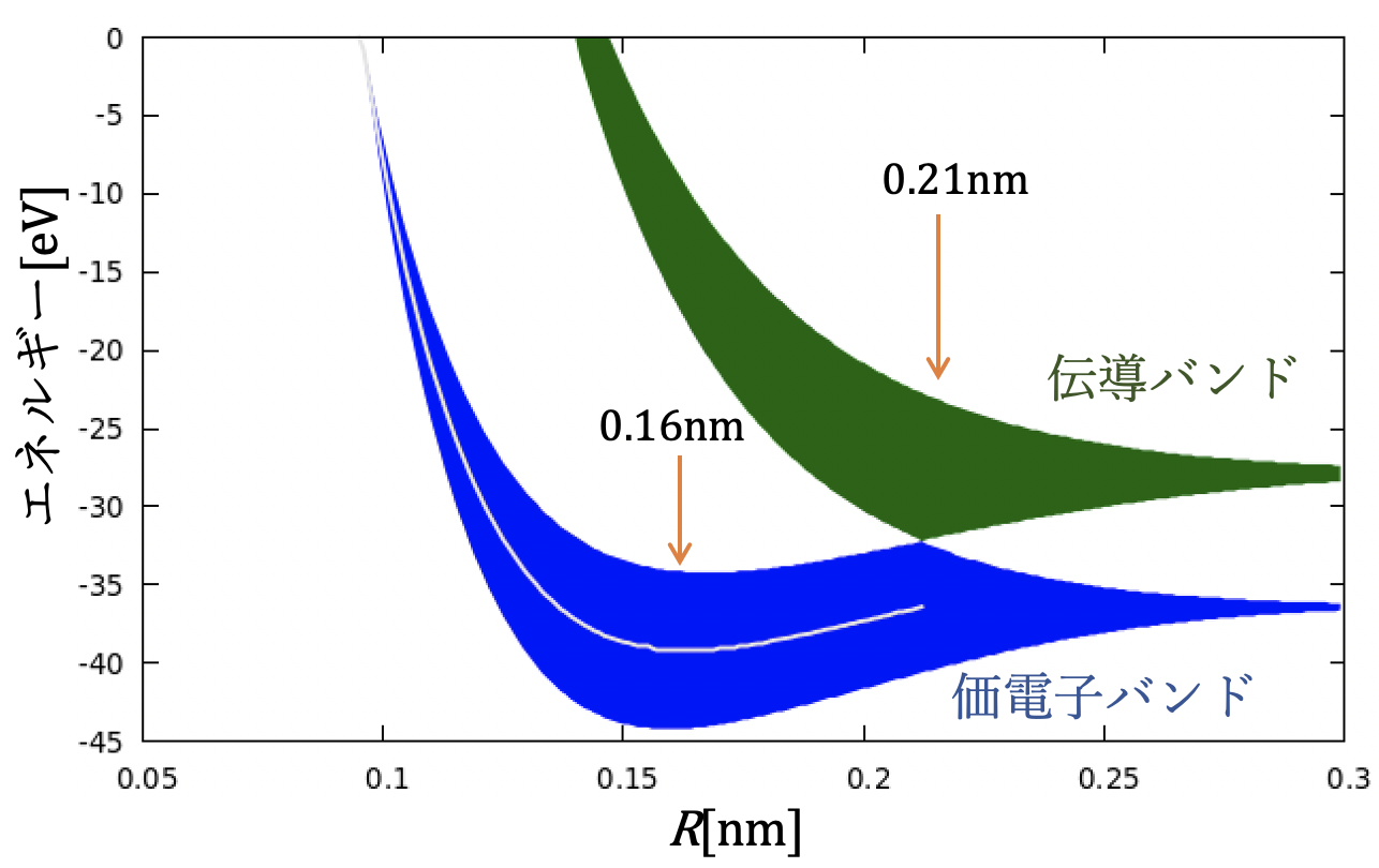 ダイヤモンドと Si 結晶について、それぞれ主量子数 2 と 3 の sp3 混成軌道に基づいてバンド構造と原子間距離を計算した。